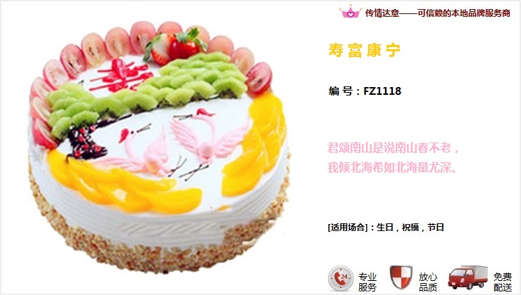 蛋糕配送 服务说明: 服务说明:贝贝琪供网上预订鲜花花束、鲜花花篮等服务,为广大用户提供一个浪漫、时尚、品质的蛋糕、鲜花预定配送平台,您只要通过麦时光网上提交好订单,我们就会为您及时送达。如有什么疑问或需要帮助请联系在线客服或拨打客服电话。 鲜花预订配送