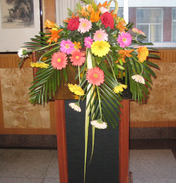 • 材   料玫瑰,扶郎花,黄白色,散尾葵等搭配 60厘米左右讲台花