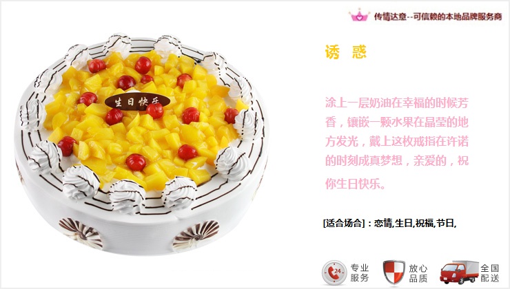 蛋糕配送 服务说明: 服务说明:贝贝琪供网上预订鲜花花束、鲜花花篮等服务,为广大用户提供一个浪漫、时尚、品质的蛋糕、鲜花预定配送平台,您只要通过麦时光网上提交好订单,我们就会为您及时送达。如有什么疑问或需要帮助请联系在线客服或拨打客服电话。 鲜花预订配送
