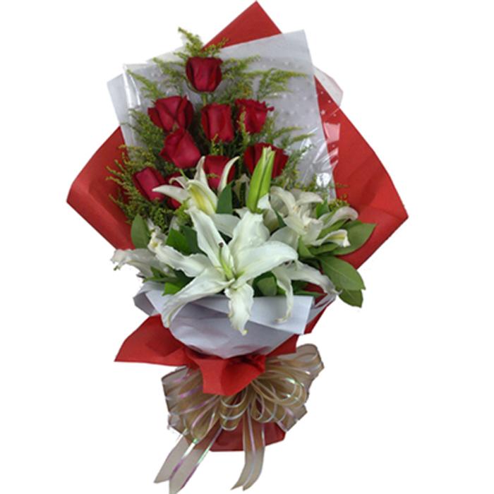 • 材   料9枝红玫瑰,1枝多头香水白百合,黄莺、栀子叶配花